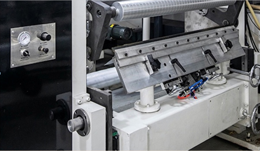 擠壓分切在國(guó)內(nèi)分切機(jī)上并不常見,它主要是由與材料速度同步并與材料有一定包角底輥和調(diào)節(jié)方便的氣動(dòng)刀組成。這種分切方式既可以分切比較薄的塑料薄膜,也可以分切比較厚的紙張、無(wú)紡布等。是一種比較方便的分切方式。是分切機(jī)分切方式的一個(gè)發(fā)展方向。